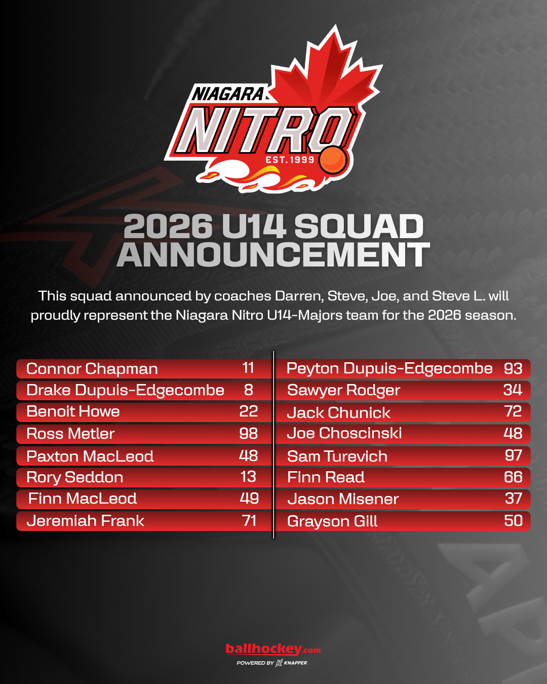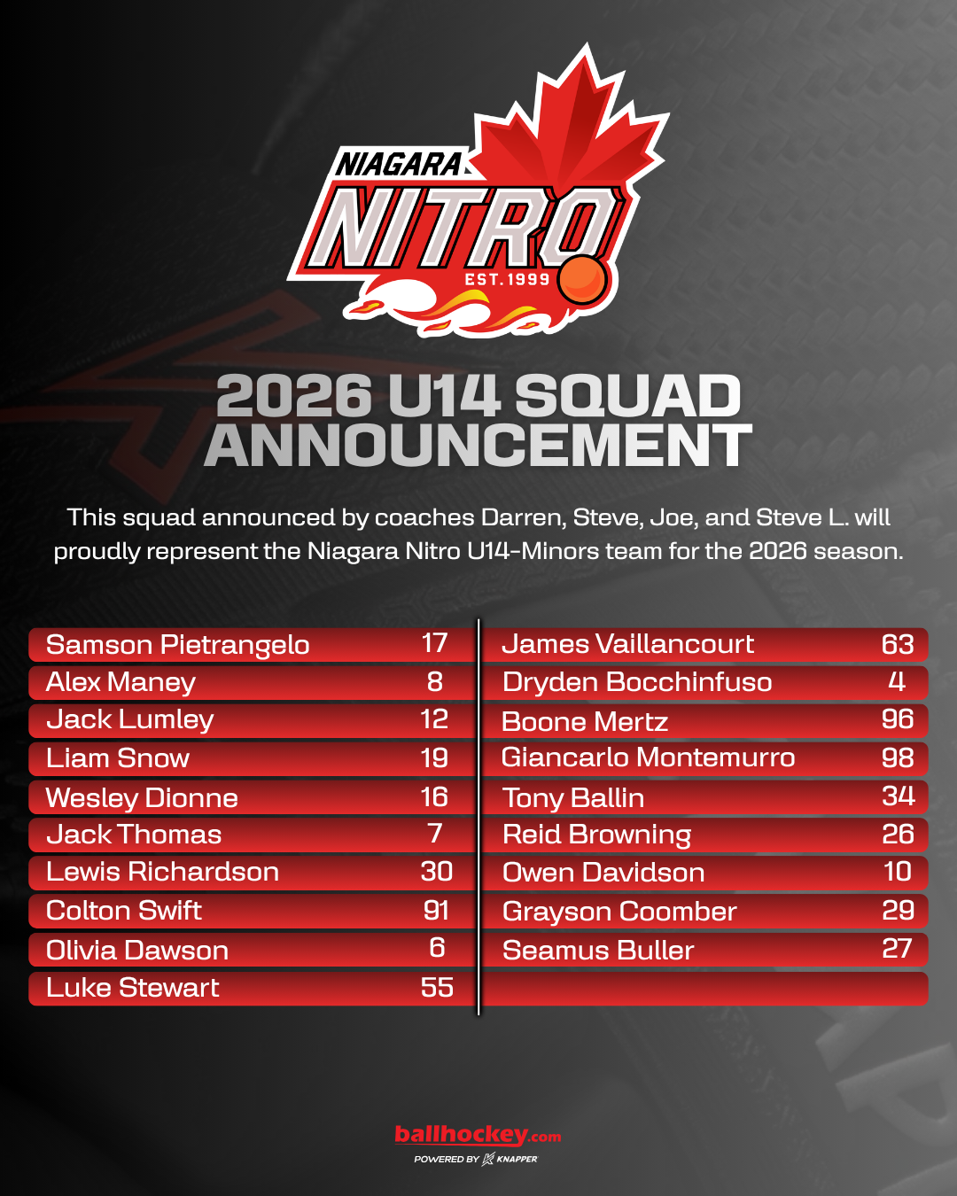 Ballhockey.com is proud to announce the 2026 Niagara Nitro team rosters, marking the inaugural season of the Niagara Nitro program.