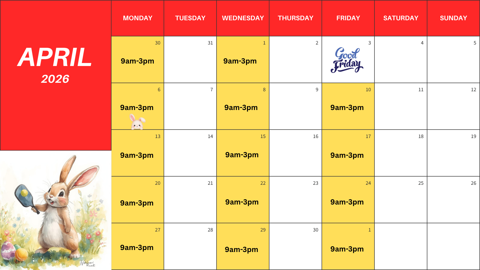 • 9:00am–3:00pm (Mostly Monday, Wednesday, Friday)